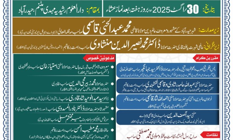 جس کی صدارت شہر حیدرآباد کے مشہور و معروف عالم دین حضرت مولانا قاضی محمد عبد الحئی صاحب قاسمی مدظلہ العالی ۔ایم اے ایم فل یونیورسٹی آف حیدرآباد تلنگانہ کریں گے اور عالمی شہرت یافتہ قاری قرآن خطیب شیریں بیاں حضرت مولانا ڈاکٹر محمد نصیر الدین منشاوی صاحب مدظلہ العالی استاد شعبہ اردو آرٹس کالج عثمانیہ یونیورسٹی حیدرآباد فرمائیں گے ان کے علاوہ مہمان مقررین رئیس القلم شیخ العرب والعجم پروفیسر حضرت مولانا ڈاکٹر سید جہانگیر صاحب حفظہ اللہ بانی و مہتمم الحرمین الشریفین عربی و انگلش دانش گاہ انٹرنیشنل یونیورسٹی نزد عثمانیہ