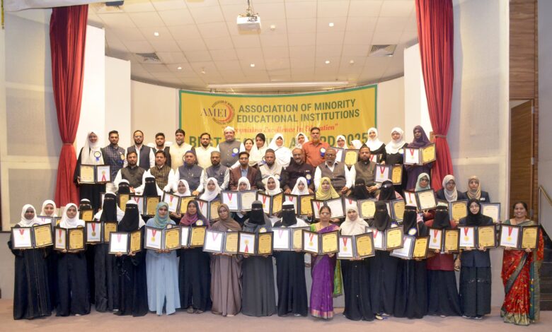Lحیدرآباد، 16 ستمبر 2025 (پریس ریلیز):ایسوسی ایشن آف میناریٹی ایجوکیشنل انسٹی ٹیوشنز (ایمی) کے زیر اہتمام یوم اساتذہ (ٹیچرز ڈے) کی ایک شاندار اور پراثر تقریب بھاسکرا آڈیٹوریم، برلا سائنس سنٹر، حیدرآباد میں منعقد ہوئی۔ اس تقریب میں صرف حیدرآباد ہی نہیں بلکہ بودھن، نرمل اور بھینسہ سے بھی اساتذہ کی کثیر تعداد نے شرکت کی۔