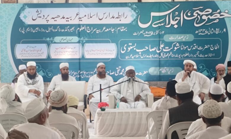 حیدرآباد ۔ بتاریخ 9/ربیع الثانی 1447ھ مطابق 02/اکتوبر 2025 بروز جمعرات بعد نماز ظہر رابطہ مدارس اسلامیہ مدھیہ پردیش کا اجلاس عمومی زیر صدارت حضرت مولانا شوکت علی صاحب قاسمی بستوی ناظم اعلیٰ رابطہ مدارس اسلامیہ و استاذ تفسیر و ادب دار العلوم دیوبند، جامعہ عربیہ سراج العلوم بھیرو گڑھ اجین میں منعقد ہوا، نظامت کے فرائض حضرت مولانا مفتی ضیاء اللہ صاحب قاسمی ناظم عمومی رابطہ مدارس اسلامیہ مدھیہ پردیش نے ادا کیے ۔