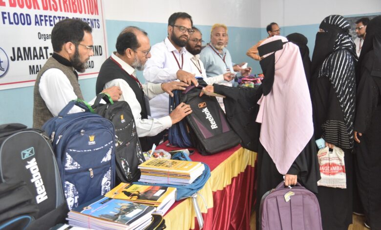 سیلاب سے متاثرہ طلبہ میں نوٹ بکس اور اسٹیشنری ائٹمس پر مشتمل بیگز کی منظم انداز میں تقسیم کے لیے جامعہ ریاض الصالحات اعظم پورہ پر ایک ڈسٹری بیوشن سینٹر قائم کیا گیا تھا۔جناب محمد مجیب االاعلیٰ امیر مقامی جماعت اسلامی ملک پیٹ نے اس کام میں حصہ لینے والے تمام والنٹیئرس بالخصوص جناب جنیدالرحمٰن قادری ، تنظیمی سکریٹری، ریلیف ٹیموں کے کوآرڈینیٹر جناب عبدالوودو ،آفس سکریٹری جناب عبدالرحیم فہیم ، ریلیف ٹیموں کے انچارج صاحبین جناب عبدالمجید نظامی ،جناب حافظ جنید حفیظ ،جناب معز الدین آصف اور جناب عبدالباری کی بے لوث و مخلصانہ خدمات کی تحسین کرتے ہوئے ان سبھی کے حق میں دعائے خیر کی۔