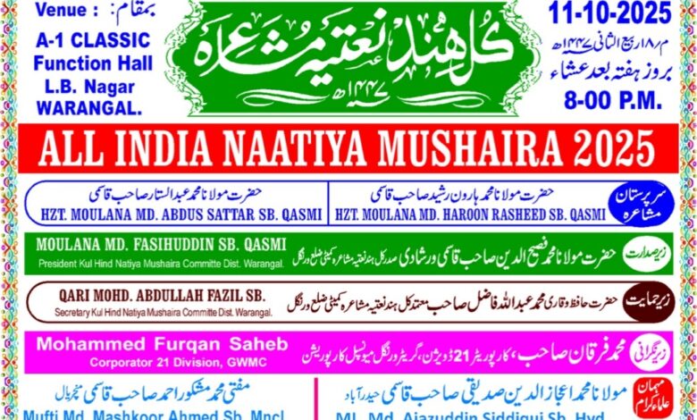 ورنگل میں 11 اکتوبر کو کل ہند نعتیہ مشاعرہ