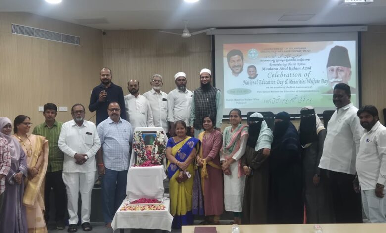 پداپلی، 11 نومبر (نامہ نگار) — محکمۂ اقلیتی فلاح و بہبود کے زیرِ اہتمام آج ضلع کلکٹر آفس میں بھارت رتن مولانا ابوالکلام آزادؒ کی یومِ پیدائش کے موقع پر قومی یومِ تعلیم کے سلسلے میں ایک پُروقار و شاندار تقریب کا انعقاد عمل میں آیا۔ اس موقع پر سرکاری و غیر سرکاری محکموں کے عہدیداران، سماجی رہنما، علمائے کرام اور مختلف تعلیمی اداروں کے نمائندگان بڑی تعداد میں شریک ہوئے۔