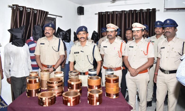 نظام آباد 16/ نومبر (ا محمد یوسف الدین خان) تلنگانہ کی نظام آباد و ڈ چیلی پولیس نے بر قی ٹرانسفو مرس کو توڑ کر کا پر کائیل کا سرقہ کرنے والی بین الریاستی ٹولی کے (8) ممبران کو گرفتار کرتے ہوئے انکے اور قبضے سے (5.50) لاکھ روپے (2) موٹر سیکل بشمول 6 سل فون اور اوزار و ہتھیار کو برآمد کیا گیا اس بات کا انکشاف نظام آباد پولیس کمشنر سائی چیتنا نے آج کمشنریٹ کا نفرنس ہال میں منعقدہ صحافتی کانفرنس میں کیا انہوں نے بتایا کہ یہ بین الریاستی گینگ اُتر پردیش ، مہاراشٹر۔ کرناٹک ، آندھرا اور تلنگانہ ریاستوں سےتعلق رکھتی ہے