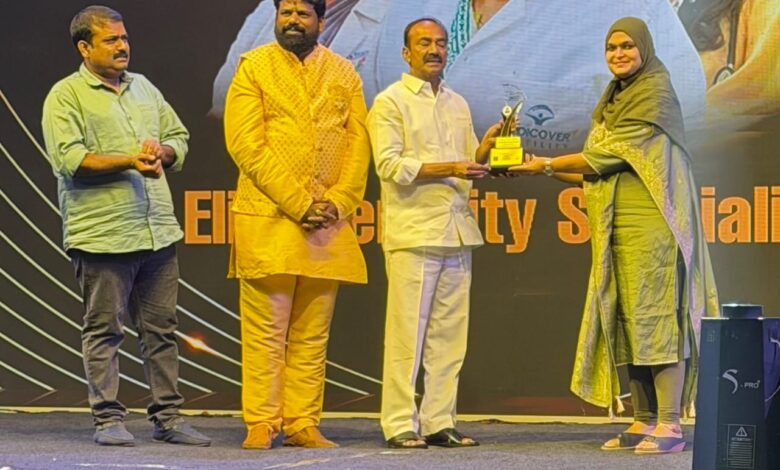 حیدرآباد۔16نومبر (راست) شہر کی ایک مشہور بریسٹ سرجن ڈاکٹر شمیم النسا شیخ کو حیدرآباد میں منعقدہ ایک باوقار تقریب میں بیسٹ ڈاکٹر ایوارڈ پیش کیا گیا۔ سابق وزیر فینانس حکومت تلنگانہ ایٹالہ راجندرکے ہاتھوں انہیں یہ ایوارڈ پیش کیا گیا۔
