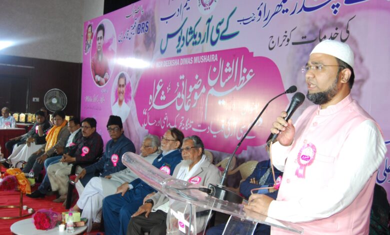 حیدرآباد11 دسمبر،( اردو لیکس) سابق چیف منسٹر تلنگانہ و صدر بی آر ایس کے چندر شیکھرراؤ کی عوامی ومختلف فلاحی خدمات کو خراج تحسین پیش کرنے کے لیے تنظیم ادب کے زیر اہتمام بی آر ایس اقلیتی قائدین کے اشتراک سے ایک عظیم الشان مشاعرہ جناب عبدالمقیت چندا سینیئر بی آر ایس قائد کی صدارت میں سالار ملت آڈیٹوریم اردو مسکن خلوت حیدرآبادمیں منعقد ہوا شعرا اور شاعرات نے منظوم و اثرانگیز انداز میں کے چندر شیکھر راؤ کی خدمات اور ان کے دور حکومت کی یادوں کو تازہ کیا