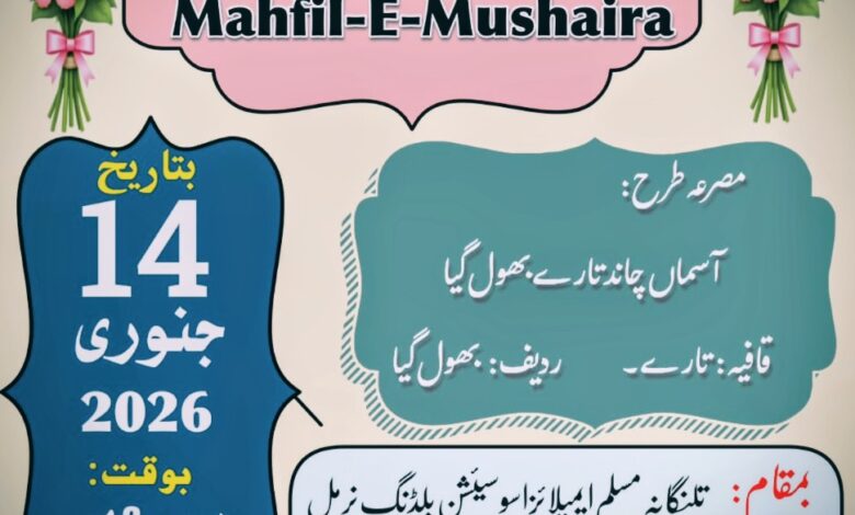 انشاءاللہ مشاعرہ بروز چہار شنبہ بتاریخ 14 جنوری 2026 بوقت دوپہر 2 بجے بمقام تلنگانہ مسلم ایمپلائز اسوسیئشن بلڈنگ نرمل منعقد ہوگا۔