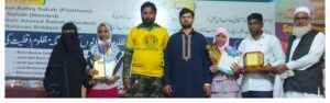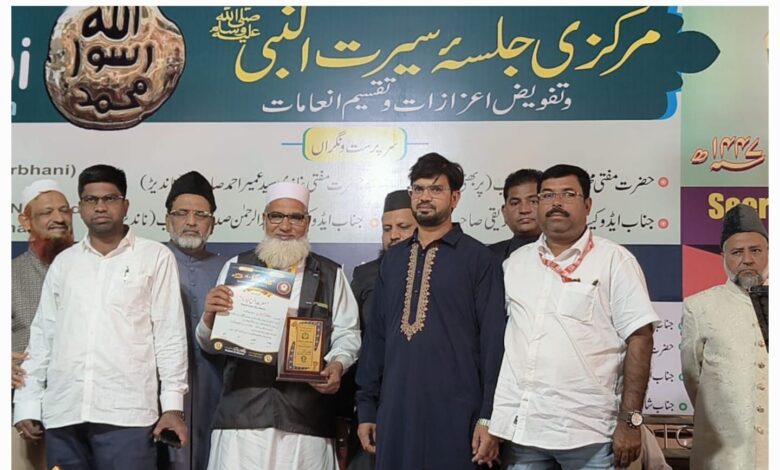بھینسہ: خادمینِ اُمت کے زیرِ اہتمام منعقدہ سیرتِ رسول ﷺ پروگرام کے اسٹیٹ لیول مرکزی جلسہ نے ناندیڑ کے حیدر باغ، حیدر گارڈن میں دینی، تعلیمی، سماجی اور صحافتی میدانوں میں نمایاں خدمات انجام دینے والوں کو ایک پلیٹ فارم پر جمع کیا۔ اس بامقصد پروگرام میں بھینسہ شہر کے تمام اسکولوں کے طلبہ نے مختلف سیرت مقابلہ جات میں جوش و خروش کے ساتھ شرکت کی۔