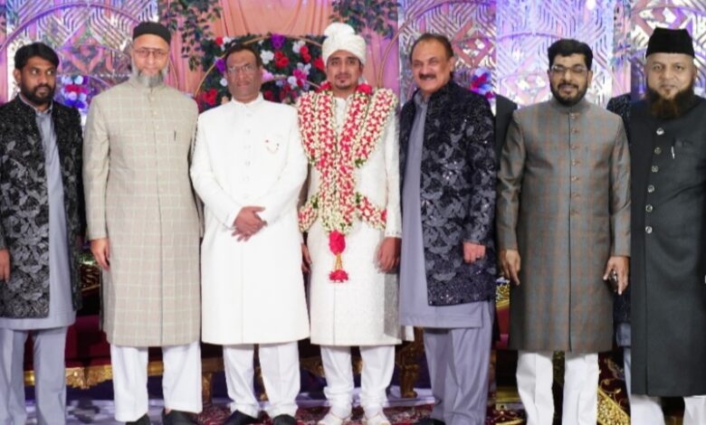 جناب خواجہ فرید الدین کی دختر کا عقد نکاح جناب سید افتخار احمد قونصلیٹ جنرل آف انڈیا (جدہ) کے فرزند ڈاکٹر سید فاروق افتخار احمد سے لنکس کراؤن کنونش میں انجام پایا۔ تصویر میں جناب بیرسٹر اسد الدین اویسی صدر مجلس اتحاد المسلمین و ایم بی حیدر آباد فہم قریشی صدر تی ایم آرامی آئی ایس، جعفر حسین معراج ایم ایل اے خواجہ فخر الدین سینئر کانگریس لیڈر را شد فراز الدین کارپوریٹر شیخ پیٹ اکبر خان اکبر ٹور اس ترویتی، حافظ محمد فیاض علی میجنگ ڈائرکٹر المیز ان ٹورس اینڈ ٹراویلیس، حامد فیاض الدین جاوید فریس الدین (رومیسا) برہان الدین است گیری و قار آباد کے علاوہ عزیز واقارب دوست و احباب کی کثیر تعداد نے شرکت کرتے ہوئے عروس و عروسہ کو مبارکباد پیش کرتے ہوئے ہو نیک تمناؤں کا اظہار کیا۔