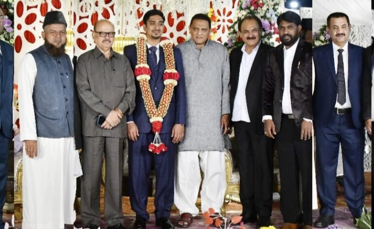 جناب خواجہ فرید الدین کی دختر جناب سید افتخار احمد قونصلیٹ جنرل آف انڈیا (جدہ ) کے فرزند ڈاکٹر سید فاروق افتخار احمدکا تقریب ولیمہ میٹرو کلاسک گارڈن آرام گھر کے موقع پر لی گئی تصویر میں محمد اظہر الدین ریاستی وزیراقلیتی بہبود اور عوامی کاروباری ادارہ جات تلنگانہ ‘سابق مرکزی وزیر اور کٹیہار سے کانگریس کے رکن پارلیمنٹ طارق انور، سابق مرکزی وزیر سرو ستیہ نارائنا،سید فیاض اسسٹنٹ۔ کمشنر پولیس (اے سی پی)گولکنڈہ، جنید فاروق الدین’ حامد فیاض الدین ‘ جاوید فریس الدین ‘خواجہ فخر الدین سینئر کانگریس لیڈر ‘راشد فرازالدین کارپوریٹر شیخ پیٹ’ حافظ رحمت اللہ طیب سینئر مجلسی قائد’ حافظ محمد فیاض علی میجنگ ڈائرکٹر المیزان ٹور س اینڈ ٹراویلس دیکھے جاسکتے ہیں۔