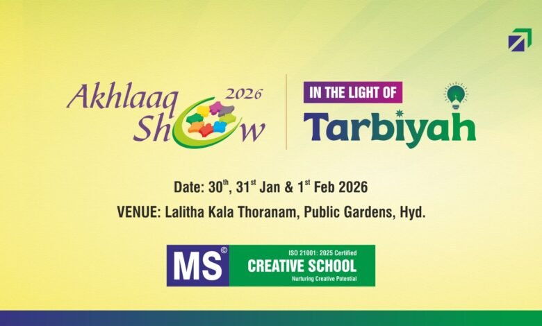 حیدرآباد، 29 جنوری (پریس ریلیز):ایم ایس کریئٹیو اسکول کے زیرِ اہتمام سالانہ عظیم الشان تین روزہ پروگرام ’اخلاق شو 2026‘ کا انعقاد 30 اور 31 جنوری اور یکم فروری 2026 کو شہرِ حیدرآباد کے ثقافتی مرکز للیتا کلا تھورانم، پبلک گارڈنز، نامپلی میں کیا جا رہا ہے۔ یہ منفرد تعلیمی و اخلاقی تقریب بچوں کی کردار سازی، اقدار کی ترویج اور تربیت کے پیغام کو عام کرنے کے مقصد سے منعقد کی جا رہی ہے۔