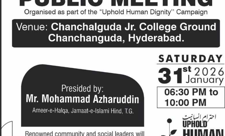 حیدرآباد ۔جناب سید محمد عبد القادر ناصر ‘ کنوینر اجلاس ” احترام انسانیت” مہم کی اطلاع کے بموجب سماج میں بڑھتے ہوئے قتل و تشدد کے واقعات، منشیات کا سیلاب اور سماجی برائیوں کے خاتمہ اور ان برائیوں کے خلاف عوام الناس کو بیدار کرنے کی غرض سے جماعتِ اسلامی ہند، عظیم تر حیدرآباد کے زیرِ اہتمام ایک عظیم الشان جلسہ عام بعنوان ’’احترامِ انسانیت‘‘ بروز ہفتہ، 31 جنوری 2026 کو چنچل گوڑہ جونیر کالج گراؤنڈ، چنچل گوڑہ، حیدرآباد پر منعقد ہوگا۔
