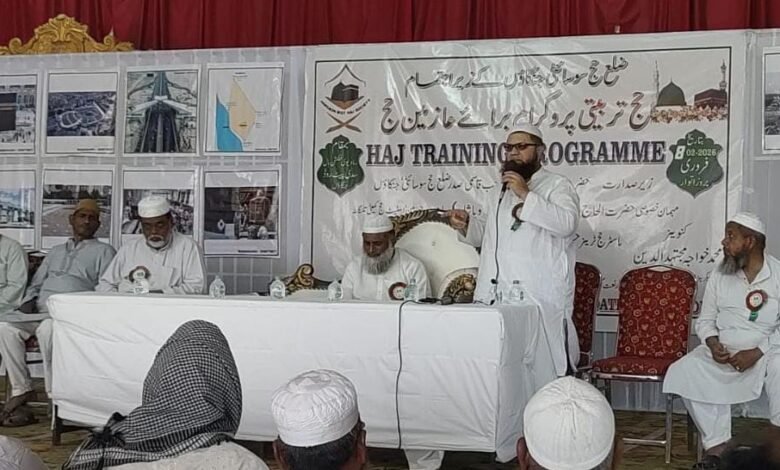 انہوں نے کہا کہ حاجیوں کو جہاں پر بدنی تیاری کرنی ہوتی ہے وہیں پر تقوی کو اختیار کرنے کی ضرورت ہے حج ایک عاشقانہ عبادت ہے اور انسان حج میں اللہ سے بے انتہا قریب ہوتا ہے انہوں نے حاجیوں سے دعائیں کرنے کی اپیل کی جن جن مقامات پر دعائیں قبول ہوتی ہیں وہاں پر کتابوں سے دعائیں پڑھنے کے بجائے دعائیں مانگنے کا انہوں نے مشورہ دیا انہوں نے کہا کہ حاجی اللہ کا مہمان ہوتا ہے اور سفر حج کے دوران ہونے والی پریشانیوں یا تکالیف پر صبر کرنے اور ایک دوسرے کو برداشت کرنے کا انہوں نے جذبہ رکھنے کا مشورہ دیا تفصیلی طور پر حج کے پانچ دن اور مدینہ منورہ کے زیارت کے اداب بھی بتلائے انہوں نے حجاج کرام کو مبارکباد دی اور مسلسل تربیتی پروگرام میں شرکت کرنے کا بھی مشورہ دیا –