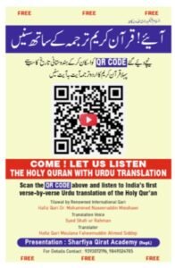 انہوں نے مزید کہا کہ ہندوستانی تاریخ کا یہ سب سے پہلا آیت بہ آیت اردو ترجمہ ہے اس ڈیجیٹل قرآنی ترجمے کو QR کوڈ کے ذریعہ بھی ڈاؤن لوڈ کیا جا سکتا ہے جو کہ بالکل مفت ہے QR code یہ ہے۔