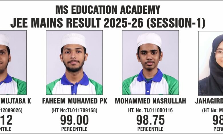 اسی تسلسل میں ایم ایس ایجوکیشن اکیڈیمی کے آٹھ مزید طلباء نے بھی قابلِ فخر نتائج حاصل کیے۔ ان میں محمد نصراللہ 98.754 پرسنٹائل،جہانگیر دار رومانہ جمیر 98.077 پرسنٹائل،عمار عزیز خان 98.066 پرسنٹائل،نورالدین احمد 97.928 پرسنٹائل،محمد ازان الدین 97.882 پرسنٹائل،امان صمد پی 97.882 پرسنٹا،,رشاد احمد خان 97.844 پرسنٹائل،محمدہادی 97.659 پرسنٹائل،شیخ ارباز احمد 97.584 پرسنٹائل،سید حسیب بخاری97.487 پرسنٹائل،عاقب مسعود 97.231 پرسنٹائل شامل ہیں، جنہوں نے جے ای ای مین جیسے سخت امتحان میں اعلیٰ معیار کی کارکردگی پیش کی۔اس طرح جے ای ای مین 2026سیشن1میں 19طلباء نے 95 پرسنٹائل سے زآئد اور29 طلباء نے 90 پرسنٹائل سے زائد کا اسکور حاصل کیا ۔