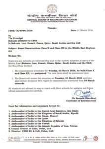 نئی دہلی ۔ مشرق وسطیٰ کے ممالک میں کل ہونے والے سی بی ایس ای کے امتحانات ملتوی کر دیے گئے ہیں۔ سی بی ایس ای نے اعلان کیا ہے کہ وہ ایران، امریکہ اور اسرائیل کے باہمی حملوں کی وجہ سے 2 مارچ کو ہونے والے کلاس 10 اور 12 کے امتحانات ملتوی کر رہا ہے۔