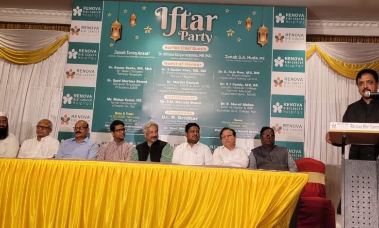 ان خیالات کا اظہار ڈاکٹر پی سر یدھرنے رینوا بی بی کینسر ہاسپٹل ملک پیٹ کی جانب سے افیسرس میس ملک پیٹ حیدرآباد میں منعقدہ دعوت افطار تقریب سے مخاطب کرتے ہوئے کیا اس تقریب میں ڈاکٹرز انجینیئر ز اور سماج کی سرکرد ہ و سربرآوردہ شخصیات نے شرکت کی ڈاکٹر سریدھرنے سلسلہ خطاب جاری رکھتے ہوۓ کہا کہ کینسر کے مریضوں کا کم فیس پر علاج کرنے کے لیے بہت سارے ڈاکٹرز نے اپنی خدمات کا پیشکش بھی کیا ہے جو خوش آئند بات ہے انہوں نے کہا کہ کینسر کے علاج کے طبی آلات خریدنے کے لیے 50 تا 60 کروڑ روپیوں کی ضرورت ہوتی ہے
