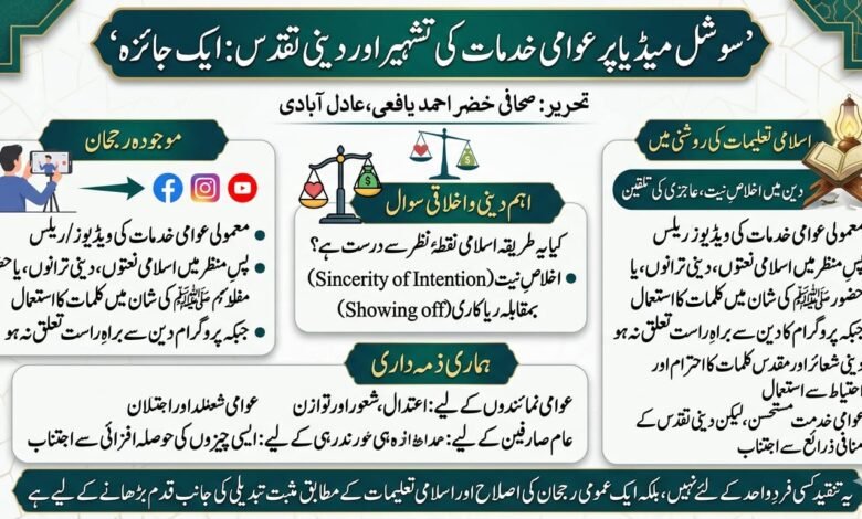 یہاں یہ بات بھی قابلِ ذکر ہے کہ اسلام میں عوامی خدمت ایک مستحسن عمل ہے، اور اگر کوئی شخص اخلاص کے ساتھ خدمت انجام دیتا ہے تو وہ یقیناً قابلِ تحسین ہے۔ تاہم، اس خدمت کو نمایاں کرنے کے لئے ایسے ذرائع اختیار کرنا جو دینی تقدس کے منافی ہوں، ایک قابلِ اصلاح پہلو ہے۔ اس سلسلے میں اعتدال اور شعور کی ضرورت ہے تاکہ دین اور دنیا کے معاملات میں توازن برقرار رکھا جا سکے۔