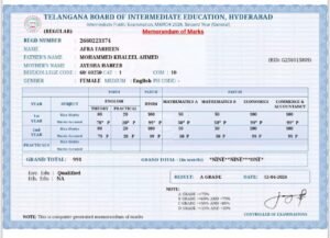 انہوں نے ایم ای سی میں 1000 میں سے 991 نمایاں نمبرات حاصل کرتے ہوئے اے گریڈ حاصل کیا جو ان کی محنت لگن اور تعلیمی قابلیت کا منہ بولتا ثبوت ہے۔ ان کی اس نمایاں کامیابی سے نہ صرف ان کے خاندان بلکہ پورے تلنگانہ میں خوشی کی لہر دوڑ گئی ہے اور وہ دیگر طلبہ کے لیے ایک مثال بن گئی ہیں۔