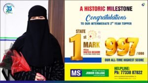 ایم ایس جونیئر کالج کی مجموعی کارکردگی بھی اس سال نہایت شاندار رہی، جہاں 55 طلبہ نے 990 سے زائد نشانات حاصل کیے۔ بائی پی سی اور ایم پی سی دونوں شعبوں میں 618 طلبہ نے950 پلس اور 1126 طلبہ نے 900 پلس اسکور حاصل کرتے ہوئے ادارے کے مضبوط تعلیمی نظام کو ثابت کیا۔