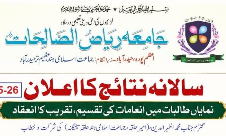 جامعہ ریاض الصالحات، اعظم پورہ،حیدرآباد کے سالانہ نتائج کا اعلان