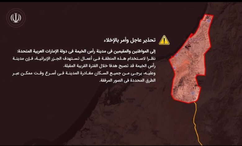راس الخیمہ کے شہریوں اور رہائشیوں کے نام— چونکہ اس علاقے کو ایرانی جزائر کے خلاف کارروائیوں میں استعمال کیا جا رہا ہے، اس لیے آئندہ دنوں میں اس شہر کو نشانہ بنایا جا سکتا ہے۔ لہٰذا تمام افراد سے درخواست ہے کہ وہ فوری طور پر مقررہ راستوں کے ذریعے شہر چھوڑ دیں۔