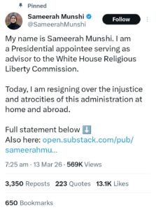 سمیرا منشی، جو ایک معروف مسلم سماجی کارکن ہیں، کو 2025 میں وائٹ ہاؤس کی مذہبی آزادی کمیشن میں مشیر کے طور پر مقرر کیا گیا تھا۔ انہوں نے کہا کہ کمیشن کے بعض ارکان کی جانب سے ان کے مذہب پر طنز کے باوجود انہوں نے یہ ذمہ داری اس امید کے ساتھ قبول کی تھی کہ وہ عام امریکی شہریوں کی مذہبی آزادی کے لیے ایک معتدل آواز بن سکیں۔