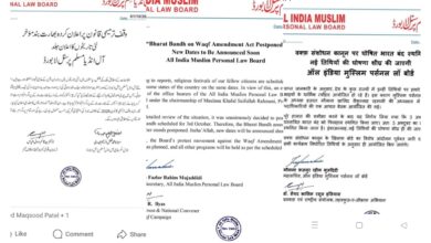وقف ترمیمی قانون پراعلان کردہ بھارت بند مؤخر نئی تاریخوں کا جلد ہوگا اعلان – آل انڈیا مسلم پرسنل لا بورڈ کی جانب سے باقاعدہ بیان جاری
