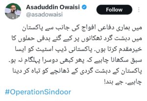 بیرسٹر اویسی نے سوشل میڈیا پلیٹ فارم ایکس پر لکھا۔میں ہماری دفاعی افواج کی جانب سے پاکستان میں دہشت گرد ٹھکانوں پر کیے گئے ہدفی حملوں کا خیرمقدم کرتا ہوں۔ پاکستانی ڈیپ اسٹیٹ کو ایسا سبق سکھانا چاہیے کہ پھر کبھی دوسرا پہلگام نہ ہو۔