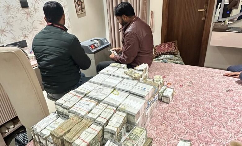 ملزم کے گھر انفورسمنٹ ڈائرکٹوریٹ کا دھاوا۔نوٹوں کے بنڈل ، سوٹ کیس سے ہیرے اور سونے کے زیورات برآمد۔ رقم گننے مشین کا استعمال