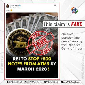 اس کے ساتھ ہی یہ خبربھی پھیل رہی ہیں کہ ریزرو بینک آف انڈیا (آر بی آئی) مارچ 2026 تک اے ٹی ایمس کے ذریعے 500 روپے کے نوٹوں کی فراہمی بند کر دے گا۔اس پس منظر میں 500 روپے کے نوٹوں پر پابندی کی خبروں پر مرکزی حکومت کی نوڈل ایجنسی پریس انفارمیشن بیورو (PIB) نے وضاحت جاری کی ہے۔