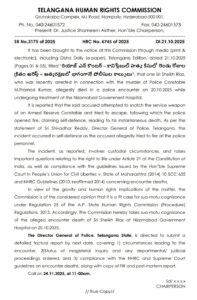 نظام آباد میں ہوئے ریاض انکاؤنٹر معاملے کو ریاستی انسانی حقوق کمیشن نے ازخود (سوموٹو) نوٹس کے طور پر قبول کرلیا ہے۔ کمیشن نے پولیس ڈائریکٹر جنرل (ڈی جی پی) کو ہدایت دی ہے کہ وہ اس انکاؤنٹر سے متعلق مکمل رپورٹ پیش کریں۔