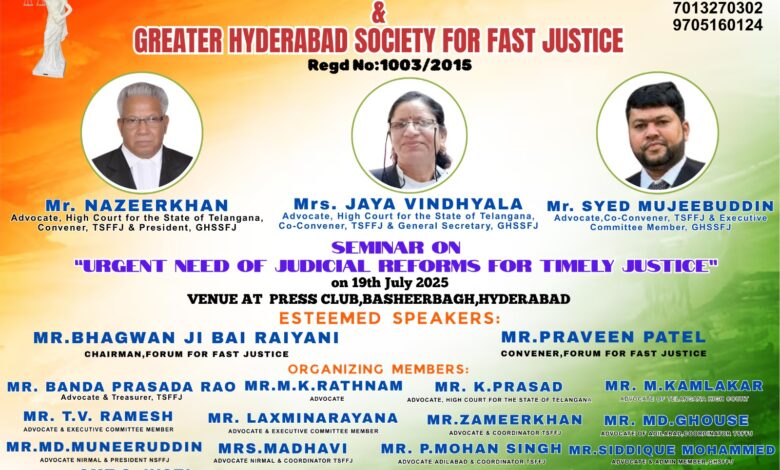 ملک میں عدالتی نظام میں تاخیر سے پیدا ہونے والے مسائل اور فوری انصاف کی ضرورت کو اجاگر کرنے کے لیے 19 جولائی 2025 بروز ہفتہ، ایک اہم سیمینار منعقد کیا جا رہا ہے۔ "بر وقت انصاف کے لیے عدالتی اصلاحات کی فوری ضرورت” کے عنوان سے یہ سیمینار پریس کلب، بشیر باغ، حیدرآباد میں دوپہر 2 بجے تا شام 5 بجے کے درمیان منعقد ہوگا۔