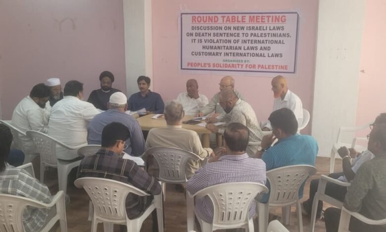 حیدرآباد(پریس نوٹ) پیپلز سالیڈاریٹی فار فلسطین کے زیر اہتمام ہفتہ کے روز سوریا لوک کامپلکس عابڈس میں ایک گول میز اجلاس منعقد ہوا، جس میں حال ہی میں نافذ کردہ اسرائیلی قانون جس کے تحت فلسطینیوں کو سزائے موت دینے کی اجازت دی گئی ہے پر تفصیلی غور و خوض کیا گیا۔ شرکاء نے اس قانون کو بین الاقوامی انسانی قوانین کی صریح خلاف ورزی اور جنگی جرم قرار دیا۔