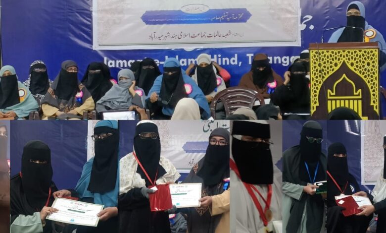 شعبہ عالمات جماعت اسلامی ہند، شہر حیدرآباد کے زیر اہتمام اختتامی جلسہ بعنوان ”موجودہ دور میں عالمات سے توقعات“ بضمن مقابلے جات سیرت النبی ﷺ(برائے طالبات دینی جامعات) وتقسیم اسناد و انعامات، لکڑ کوٹ، چھتہ بازار حیدرآباد پر منعقد ہوا۔پروگرام کی صدارت محترمہ آسیہ تسنیم صاحبہ (مرکزی اسسٹنٹ سکریٹری جماعت اسلامی ہند و مرکزی ذمہ دار شعبہ عالمات) نے فرمائی۔ اپنے صدارتی خطاب میں انہوں نے کہا کہ نبی کریم ﷺ ایسے زمانے میں مبعوث ہوئے جب دنیا ظلم، فساد، خونریزی اور اخلاقی زوال کا شکار تھی۔ آپؐ نے دنیا کو سب سے پہلا پیغام توحید کا دیا اور مساوات و عدل کی بنیاد پر ایک صالح معاشرہ تشکیل دیا۔