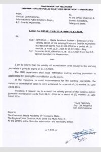 یکم جنوری 2026 سے 28 فروری 2026 تک صحافیوں کے اکریڈیشن کارڈس کی مدت میں توسیع کی گئی ہے۔ اس سلسلے میں آئی اینڈ پی آر کمشنر سی ایچ پرینکا نے احکامات جاری کیے ہیں۔