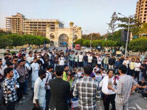 طلبہ نے کیمپس میں واقع سینٹرل لائبریری سے مین گیٹ تک ریالی نکالی اور حکومت کی جانب سے جاری کردہ حالیہ شوکاز نوٹس کے خلاف نعرے بازی کی۔ مظاہرین نے اس اقدام کو عوامی تعلیم پر براہِ راست حملہ قرار دیتے ہوئے الزام عائد کیا کہ حکومت تعلیمی اداروں کو علمی مراکز کے بجائے فاضل اراضی کے ذخائر کے طور پر دیکھ رہی ہے۔